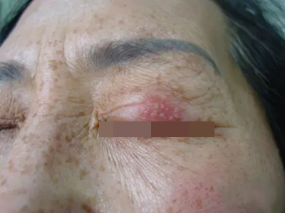 单纯疱疹性角膜炎患者右侧上眼睑存在一片密集分布的小疱疹,呈淡红色半透明状,形状不规则,表现为簇集性小水疱,疱疹周围皮肤泛红。肿胀。
