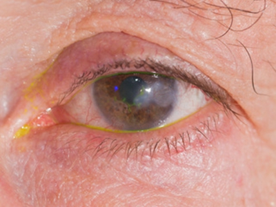 单纯疱疹性角膜炎患者的睫毛根部皮肤出现脱色泛白,眼球也出现了白斑,眼皮与眼球的交界处能够看到用荧光素染色后,出现的黄绿色泪液。