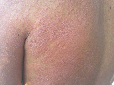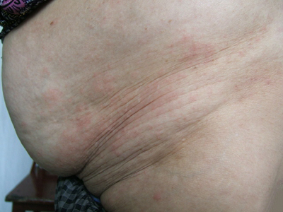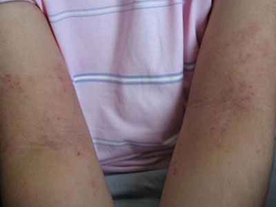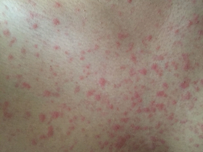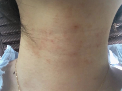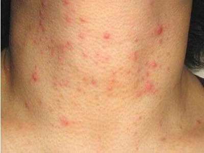 夏季皮炎会出现在后颈,表现为散在分布的小红疙瘩,微微隆起于皮肤表面,基底有一圈红晕,伴局部瘙痒感,可以适当外用止痒药物缓解不适。