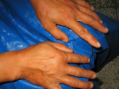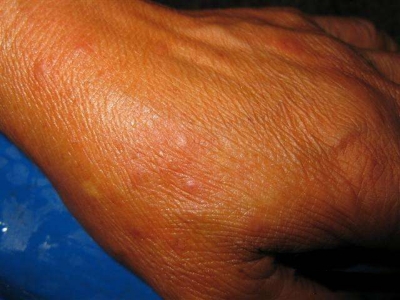 尾蚴性皮炎在手背出现症状,表现为红色小疙瘩,呈扁平状,该病潜伏期很短,接触疫水后多在15-20min即可出现局部症状,后会迅速呈红色丘疹样表现。