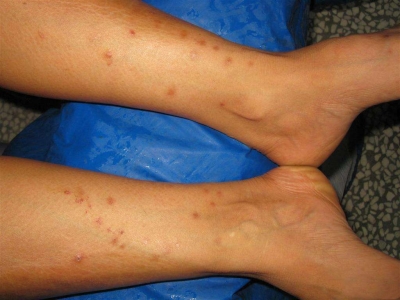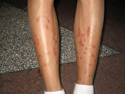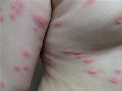 初始时仅有刺痒感,很快出现针尖至针头大小红斑,几小时后发展成水肿性、绿豆大小的淡红或鲜红色丘疹。丘疹周围可有红晕,丘疹数量增加或逐渐扩大融合成风疹块。刺痒感随病变的发展而加剧,尤以晚上奇痒难忍。奇痒常促使患者搔抓,可诱发继发性感染。