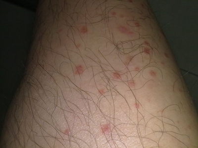 尾蚴性皮炎患者胳膊上出现绿豆大小的淡红色小丘疹,散在分布,可达数十个,伴有强烈的瘙痒,尤其夜间更加严重,患者会忍不住频繁搔抓。