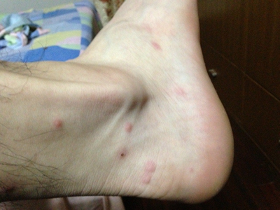 尾蚴性皮炎患者的脚踝部位出现水肿性丘疹,呈淡红色,散在分布,周围有红晕,后期丘疹数量增加,可逐渐形成风疹块,患者有强烈的瘙痒。