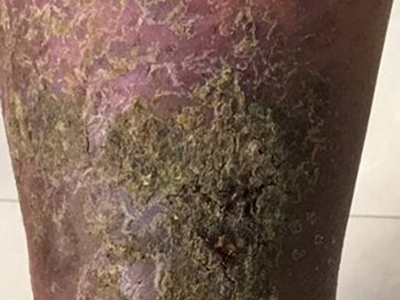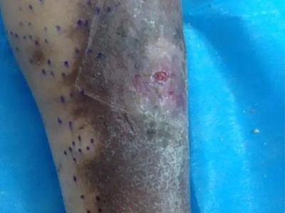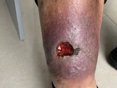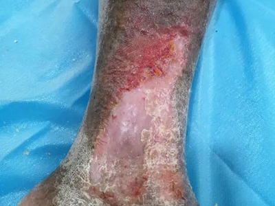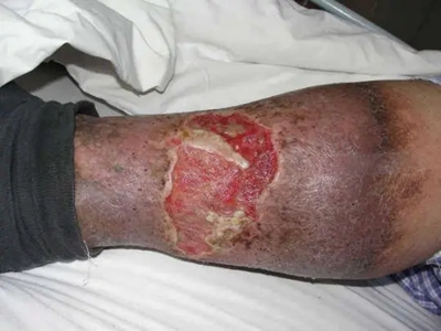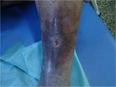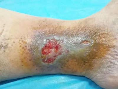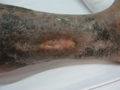 下肢深静脉血栓形成后综合征患者小腿出现色素沉着,呈现为灰黑色,皮肤增厚、粗糙,伴有鳞屑,严重时局部出现慢性溃疡,护理不当可导致溃疡面感染,出现黄色脓液。