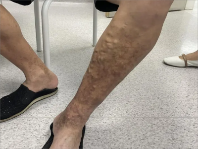 下肢深静脉血栓形成后综合征患者的小腿会出现浅静脉扩张,表现为小腿上静脉突出,像蚯蚓样凸起,同时伴有足靴处色素沉着,呈紫黑色,伴有少量白色鳞屑。