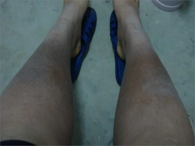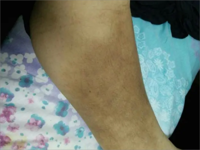 下肢深静脉血栓形成后综合征患者小腿皮肤发黑,有明显的色素沉着,伴有一定的肿胀,局部皮肤粗糙,有少量鳞屑,患者自觉腿部活动时沉重,久站或活动多后加重。