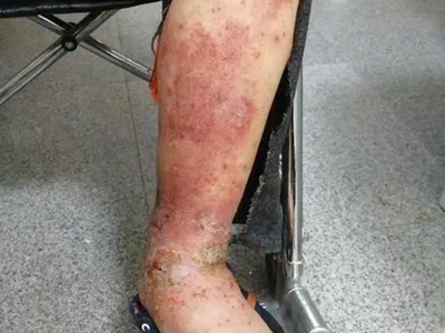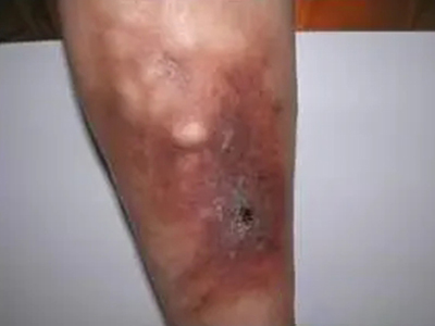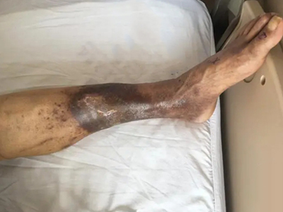 下肢深静脉血栓形成后综合征导致小腿肿胀明显,皮肤颜色加深,呈紫色,还有较深的溃疡形成,露出红色基底面,其内有渗液和渗血,创面经久不愈,易继发感染。