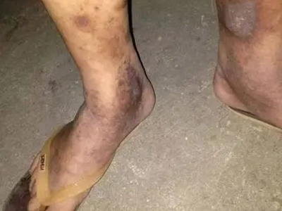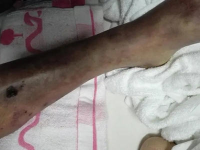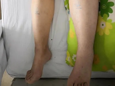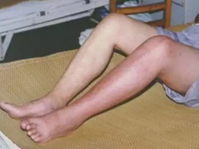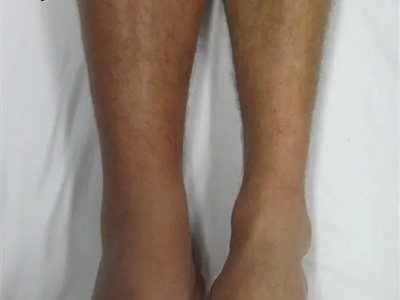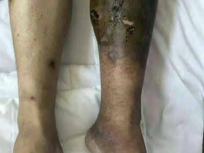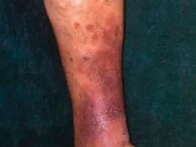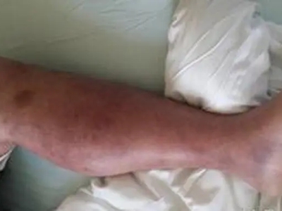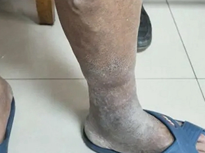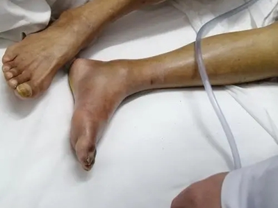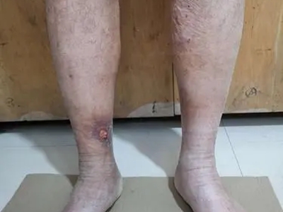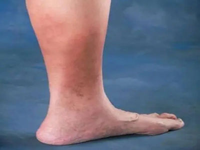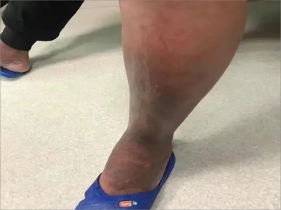 下肢深静脉血栓形成后综合征患者的脚腕皮肤呈红黑色,伴有局部组织肿胀以及溃疡结痂,同时患肢沉重不适,患者可出现间歇性跛行。