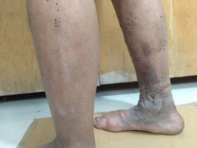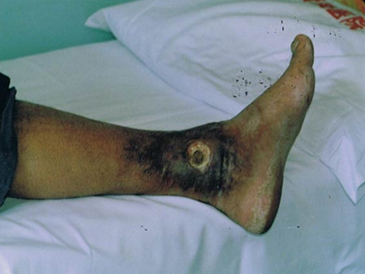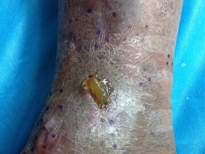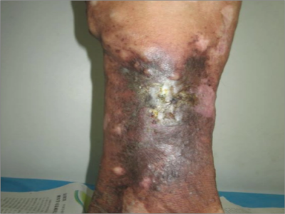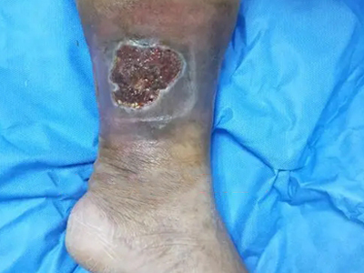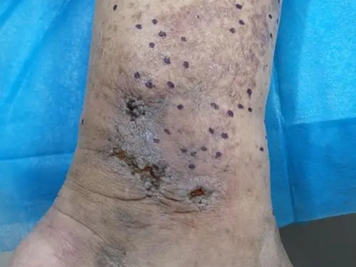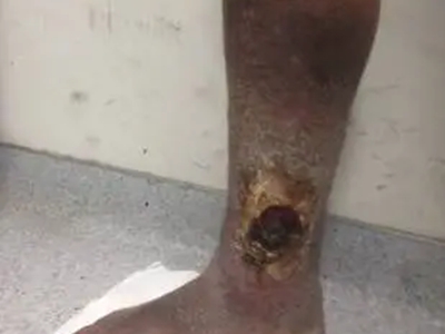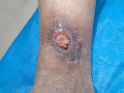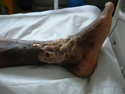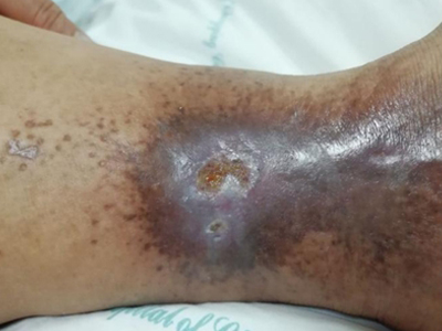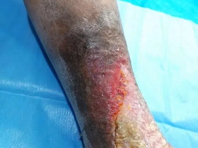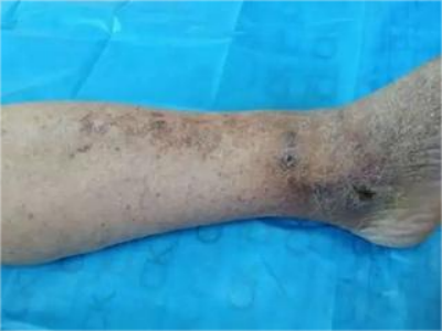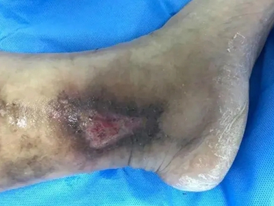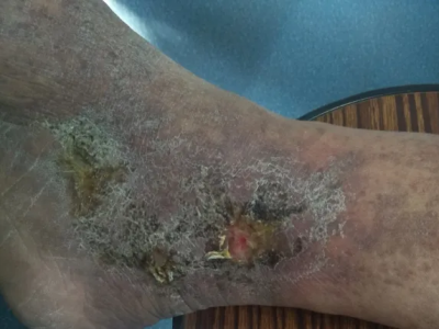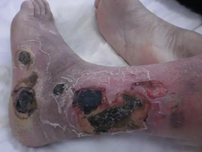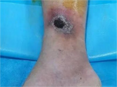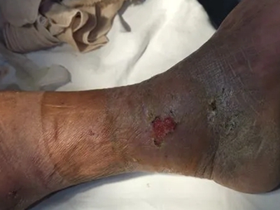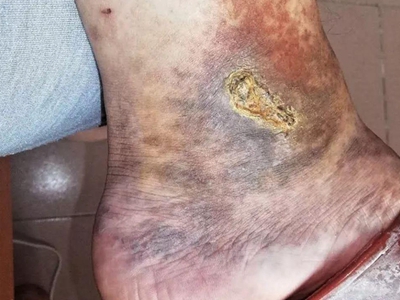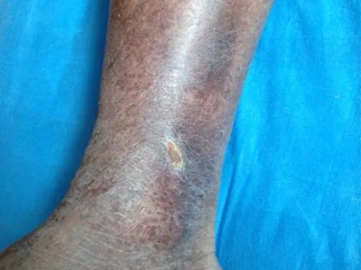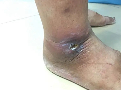 下肢深静脉血栓形成后综合征患者脚踝处有色素沉着,呈红色和黑色的斑片,斑片中间出现溃疡,溃疡面经过及时治疗,逐渐结痂、愈合。
