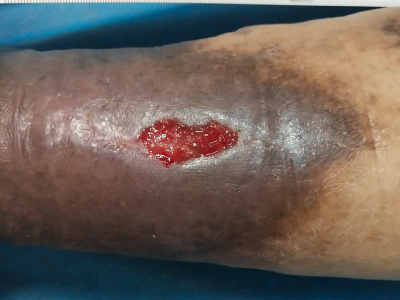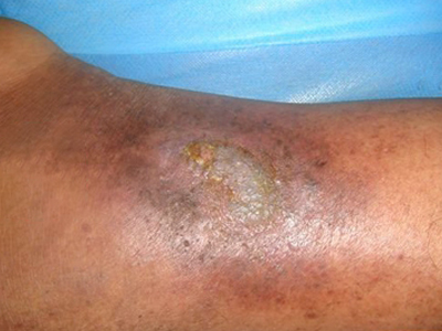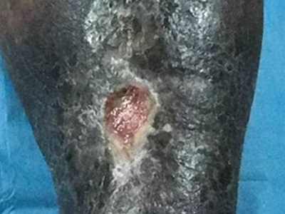 下肢深静脉血栓形成后综合征患者小腿处肿胀明显,有大面积的色素沉着斑,呈紫黑色,表面形成片状溃疡,逐渐结痂和脱屑,建议及时进行手术治疗。