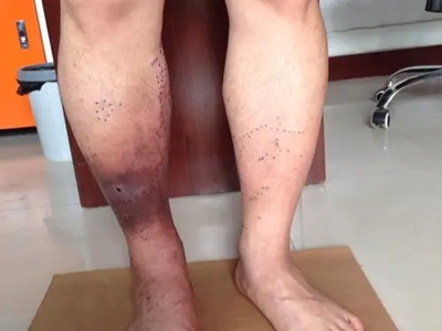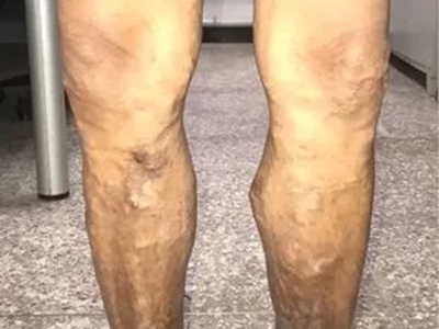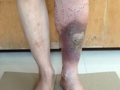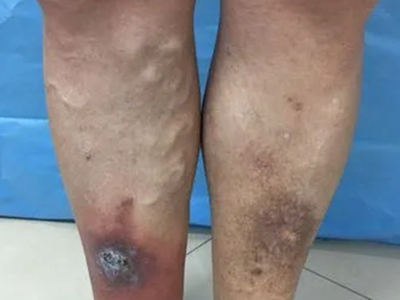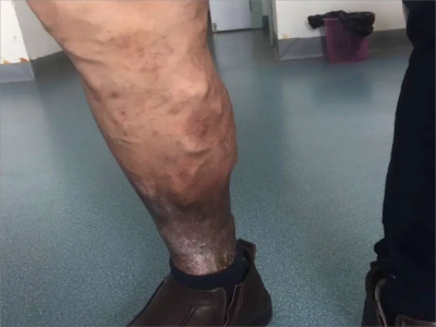 下肢深静脉血栓形成后综合征患者小腿皮肤逐渐发黑、粗糙、变硬,同时伴有小腿浅表静脉曲张,小腿上出现像疙瘩一样的连续凸起,严重时会出现局部溃疡。