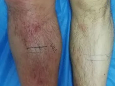 下肢深静脉血栓形成后综合征患者初期小腿红肿明显,腿围明显增粗,皮肤有轻微色素沉着,随病情逐渐加重,可会出现慢性浅表溃疡。
