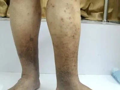 下肢深静脉血栓形成后综合征患者小腿部位有色素沉着斑,呈暗褐色或者红黑色,并逐渐形成溃疡糜烂,表面有黑痂覆盖,患者常同时伴有浅静脉扩张。