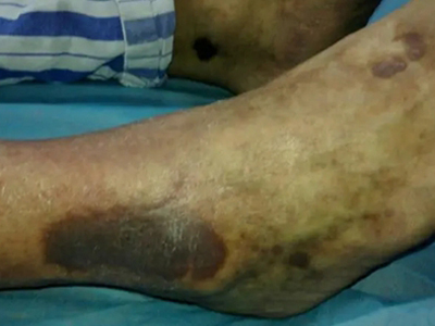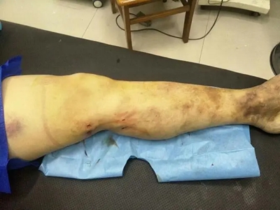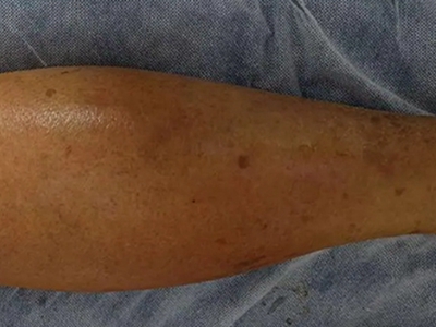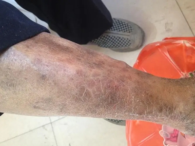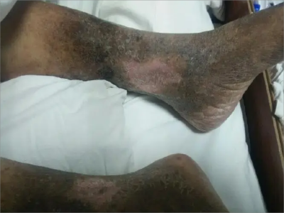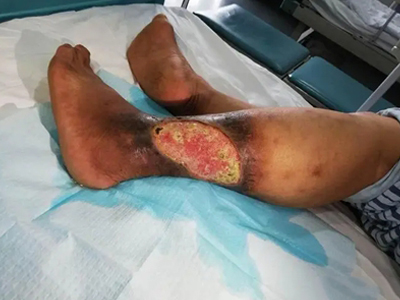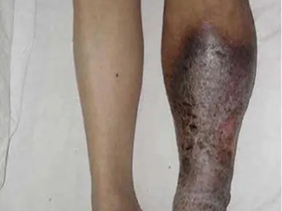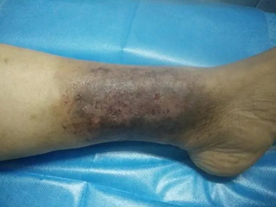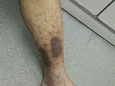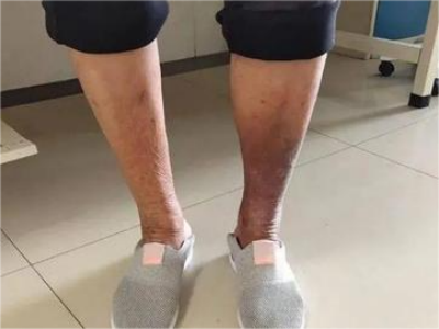 下肢深静脉血栓形成后综合征患者小腿出现大片的黑斑,是营养障碍导致的色素沉着,表皮增厚,触摸时粗糙、干燥,常伴有瘙痒、脱皮,严重时局部坏死。