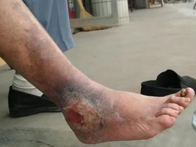 下肢深静脉血栓形成后综合征患者会在脚踝处出现色素沉着,局部皮肤发黑,同时可出现溃疡,露出红色基底面,有组织液渗出,随病情进展创面会逐渐扩大。