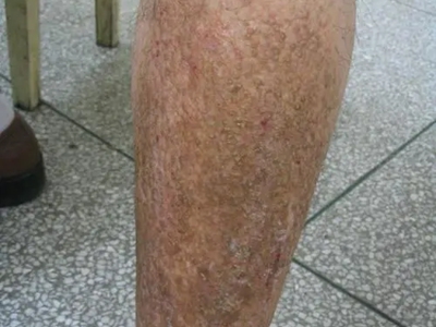 下肢深静脉血栓形成后综合征患者小腿皮肤颜色逐渐加深、发黑,局部皮肤增厚、粗糙,有一层白色的鳞屑,随病情加重可逐渐形成溃疡。