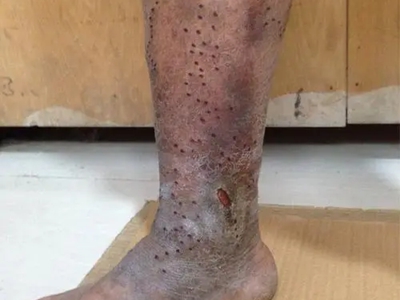 下肢深静脉血栓形成后综合征患者脚踝处皮肤出现色素沉着,颜色发黑,触摸有粗糙感,伴有脱屑,其上还可出现大坑状的溃疡,经久不愈。