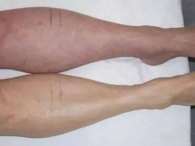 下肢深静脉血栓形成后综合征患者小腿出现浅静脉扩张,表面凹凸不平,局部有黑色的色素沉着斑,表皮瘙痒、粗糙、发硬,患者可出现间歇性跛行。