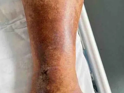 下肢深静脉血栓形成后综合征患者脚踝处有色素沉着,表现为黑色斑块,表面粗糙,有少量白色鳞屑,伴有轻微肿胀及瘙痒感,严重时会逐渐形成溃疡和坏死。