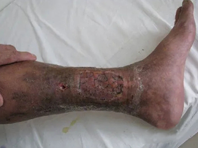 下肢深静脉血栓形成后综合征患者脚踝处有色素沉着,呈黑色,伴有鳞屑,触摸时感觉皮肤粗糙,随症状加重会出现溃疡,而且难以愈合。
