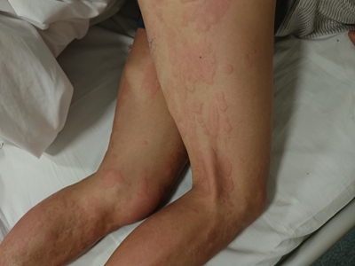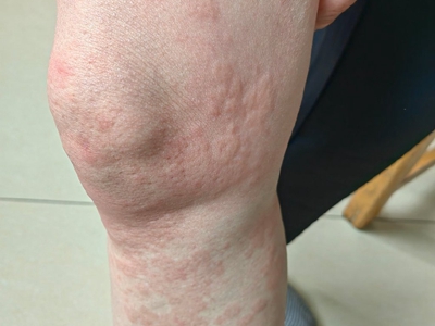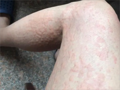 荨麻疹型药疹表现为患者腿有大片红色风团,风团微微隆起于皮肤表面,边界清楚,伴有明显瘙痒症状。随着时间推移,风团迅速蔓延至整个大腿,甚至全身。