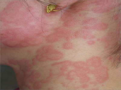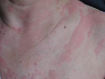 荨麻疹型药疹表现为不规则状风团,隆起于颈部皮肤表面,部分风团之间会看到较明显的分界线,使整体皮损看起来如地图状,若皮损短时间内未消退,应及时应用药物治疗。