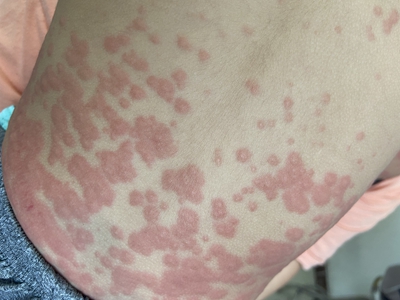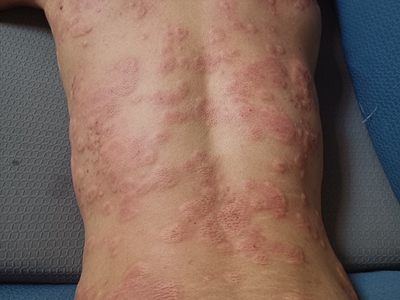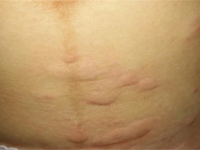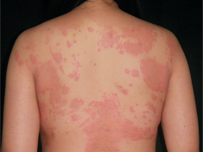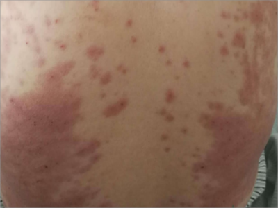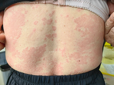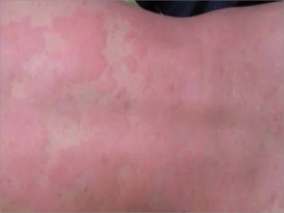 荨麻疹型药疹患者背部出现形状不规则的风团,通常会高出皮肤表面,触摸时伴有明显瘙痒感,患者搔抓后皮损部位会扩大并融合成片。
