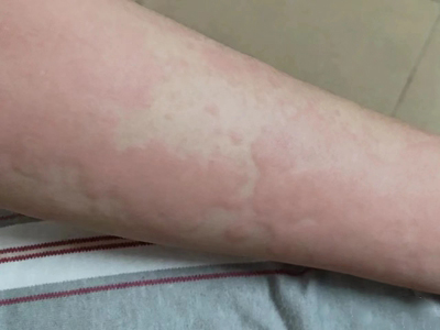 荨麻疹型药疹手臂上有一大片红色风团图