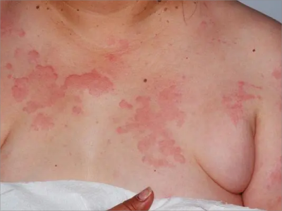 荨麻疹型药疹导致患者胸部出现大小不等的风团,颜色较一般荨麻疹色泽红,持续时间较长,患者自觉瘙痒,也会伴有刺痛、触痛,严重者会合并出现血管性水肿。
