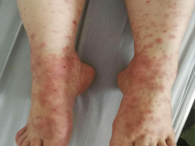 荨麻疹型药疹发生于患者脚踝部,表现为界限清晰的类圆形红斑,部分相互融合后形状不规则,偶有红斑中央皮肤与正常皮肤相同,患者也不会出现不适症状。