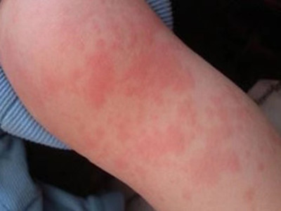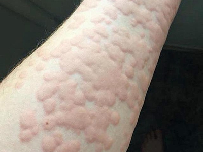 荨麻疹型药疹常由于服用后过敏所致,可发生任何年龄,患者表现为手臂上出现风团皮疹,高出于皮肤表面,呈红色,风团之间可互相融合成片。