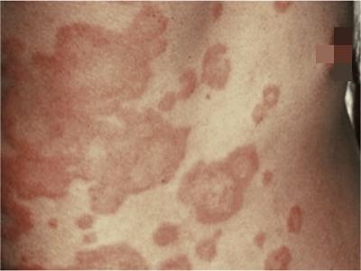 荨麻疹型药疹在患儿肋部表现为红色斑片样皮损,颜色分布不均,中间颜色稍浅,边缘颜色稍深,呈大型环状红斑,此时患处会有轻微瘙痒感。