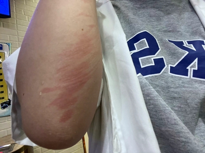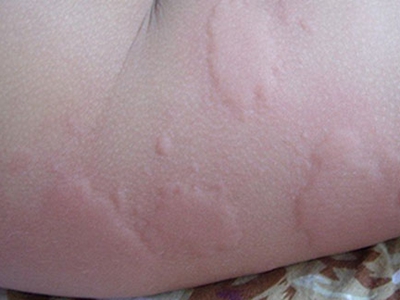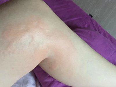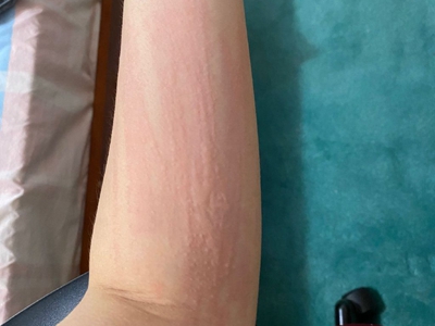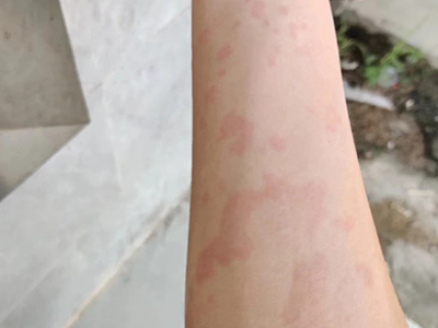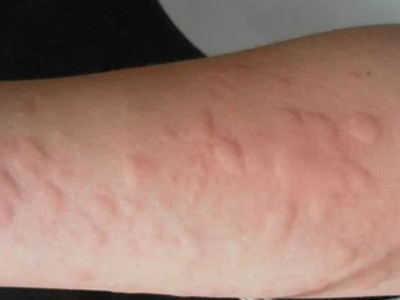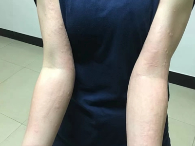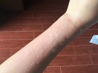 荨麻疹型药疹起病常较急,患者胳膊上瘙痒部位出现一片红色风团,随病情加重,会逐渐泛发全身。由于患处出现瘙痒,患者会不由自主进行抓挠,并留下痕迹。