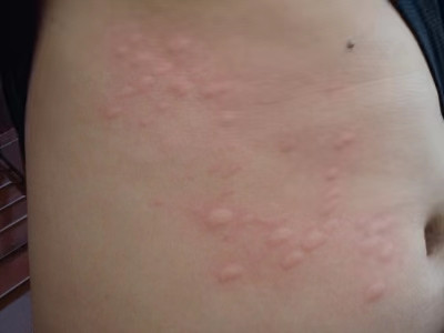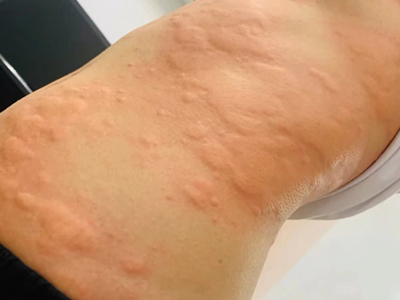 荨麻疹型药疹患者肋骨部位的皮肤长了很多风团,呈红色隆起,略高于皮面。随病情发展,中央部分消退呈黄白色,但与周围正常皮肤边界较清楚。