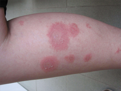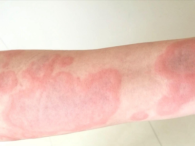 荨麻疹型药疹会在胳膊上出现风团,融合成片,这是症状逐渐减退的表现,中央消退后呈环状、地图状或不规则状,完全消退后并不会有痕迹。