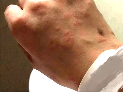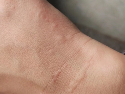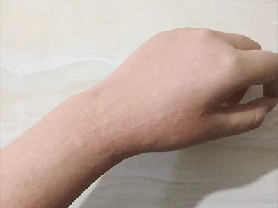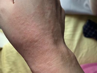 荨麻疹型药疹累及到患者手腕时,可表现为风团,呈肉色或苍白色,地图状或不规则状,密集分布,风团之间也可互相融合,伴随剧烈瘙痒。