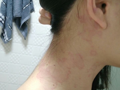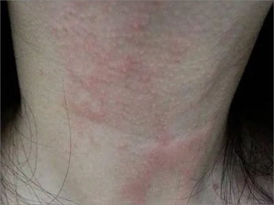 荨麻疹型药疹患者脖子上出现许多潮红色的斑片状风团疙瘩,部分风团融合成片,呈圆形、椭圆形或不规则形,逐渐消退的风团会呈地图状,局部瘙痒剧烈。