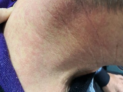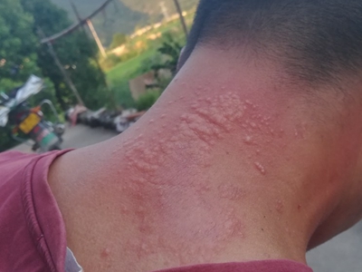 荨麻疹型药疹表现为密集的红色斑丘疹,距离较近者会相互融合成片,随病情发展,皮损会布满整个后颈部,患者常因瘙痒而挠抓患处。