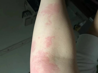 荨麻疹型药疹出现在患者胳膊的部位,表现为较大的片状红疙瘩,皮损较多者呈橘皮样外观,患者感到皮损处存在剧烈瘙痒感,但并不属于较严重的情况。