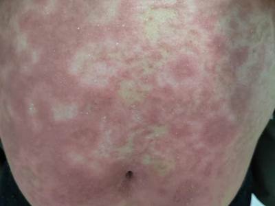 荨麻疹型药疹腹部皮肤上遍布红斑,之间可以互相有融合,形状并不规则,颜色分布也不均匀,有深有浅,略突出于皮肤表面,其上附有少量白色鳞屑,瘙痒明显。