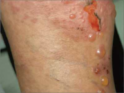 IgA天疱疮患者小腿上有大片的红斑,边缘隆起,与周围皮肤边界清晰,中间皮肤增厚外观类似苔藓样改变,苔藓样红斑上会有多个类似于半球形的水疱生成。