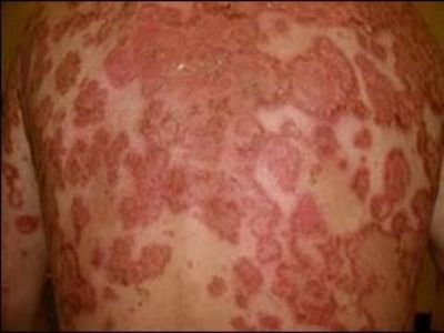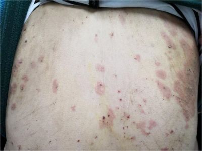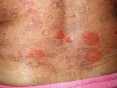 IgA天疱疮后背大面积圆形红斑伴有结痂图
