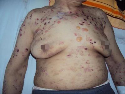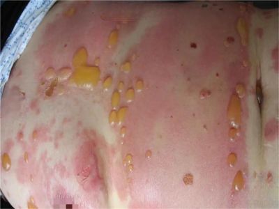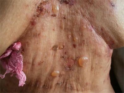 IgA天疱疮胸部大片红斑并伴随黄色的水疱图