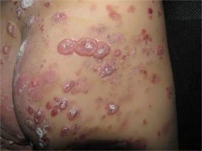IgA天疱疮的临床表现类似于角层下脓疱病,在环形或多环形红斑的基础上发生松弛性水疱、脓疱,脓疱有融合成环形或漩涡状的趋势,皮损糜烂伴中央结痂。发病初期水疱小,疱液澄清,以后逐渐变大,有融合倾向,或排列呈环状。单个皮损可在2-3周自愈,别处又有新发皮损,罕见患者累及口腔黏膜。自觉瘙痒明显,多数患者无全身症状或症状轻微。
