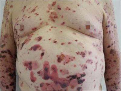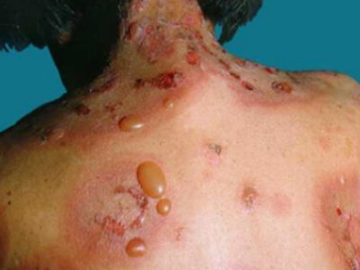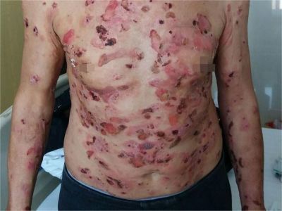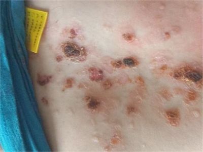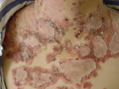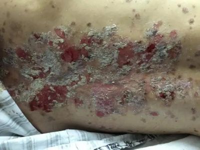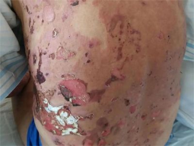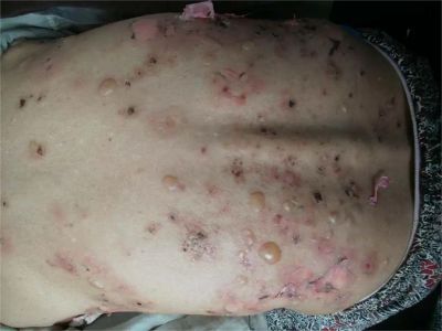 IgA天疱疮全身皮损泛发,整个背部皮肤潮红,可以看到大片的皮肤增厚及褐色痂块,还有几个隆起的花生大小的水疱,痂皮表面有白色鳞屑。
