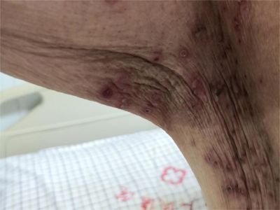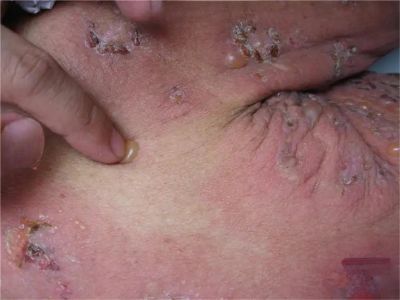 IgA天疱疮患者腋窝的皮肤有很多形状不规则的红斑,在红斑基础上有几个水疱和红褐色的痂皮,患者自觉瘙痒明显,无全身症状。