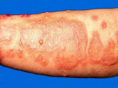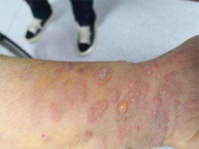 IgA天疱疮患者胳膊手腕内侧有数目不等的红斑,边缘界限清晰,在红斑基础上会发生松弛型的水疱,疱内液体澄亮呈淡黄色,伴有瘙痒感。