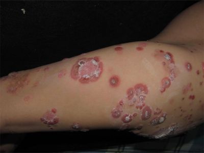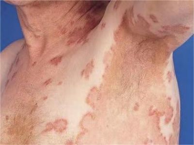 IgA天疱疮波及全身出现类圆形、不规则形红斑,颜色深浅不一,与周围正常皮肤境界划分不清,表面会出现结痂现象,痂块与红斑形态相似,多是由于水疱破裂引起。