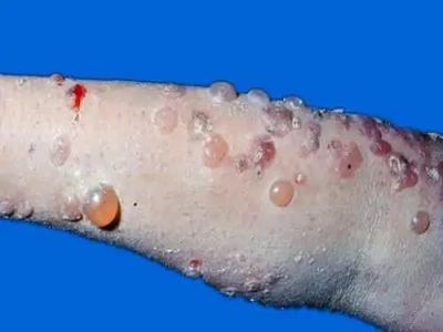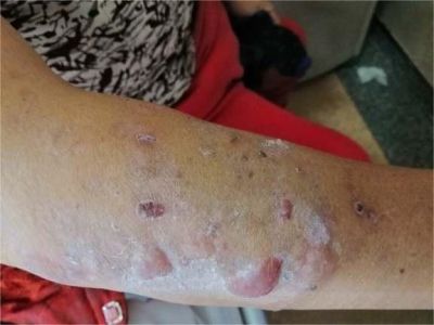 IgA天疱疮累及胳膊,表现为形状不规则的红色水疱,疱壁较厚,疱皮较松弛,边界清楚,疱液干涸后会形成暗褐色的结痂,有瘙痒感,但多无全身症状。