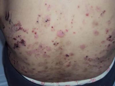 IgA天疱疮导致患者背部结小块痂,聚集分布但不会相互融合,颜色可以为黑色或淡红色,痂片表面较硬,边缘也会出现翘皮现象,痂片掉落后会出现红润光滑的皮肤。
